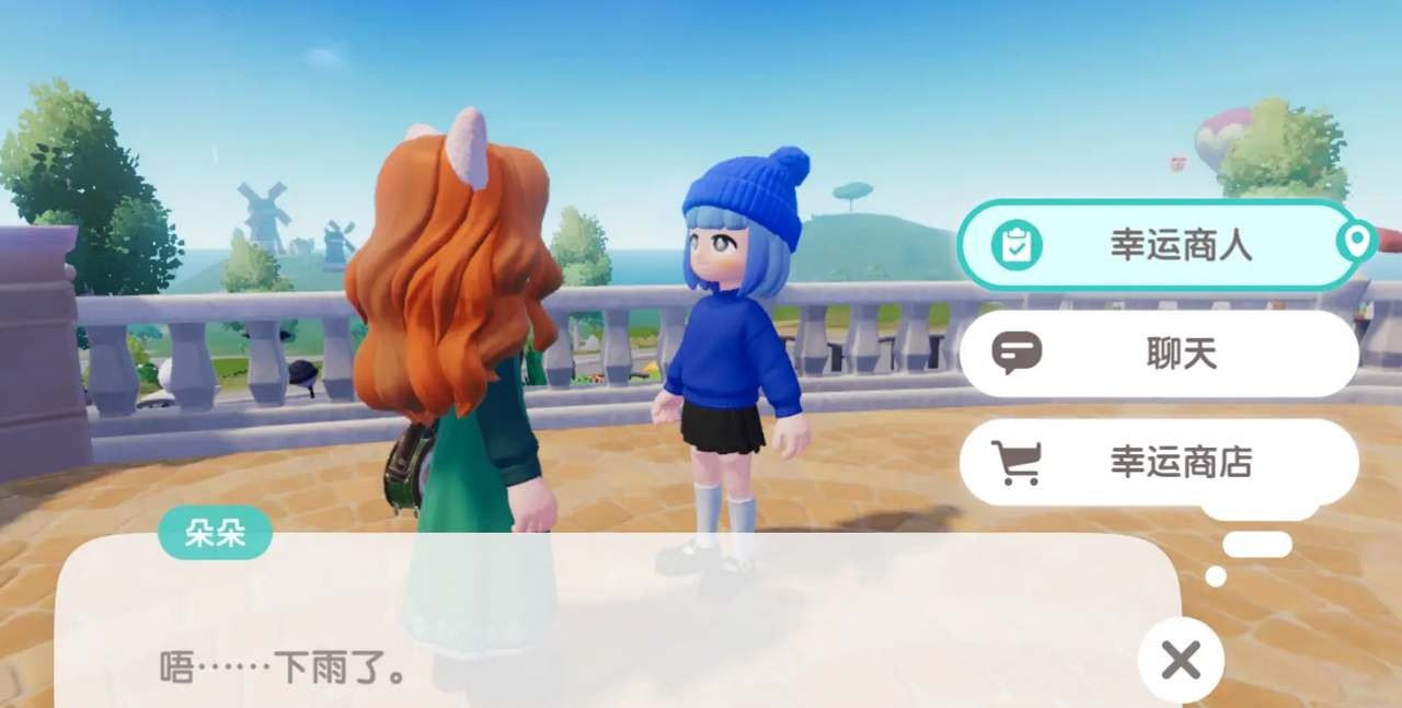 幸运商人朵朵只有在雨天或者彩虹天气的时候才会出现。出现的位置是艺术街,如下图所示,可以找到她。