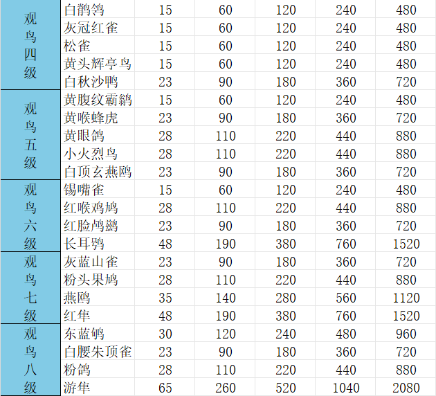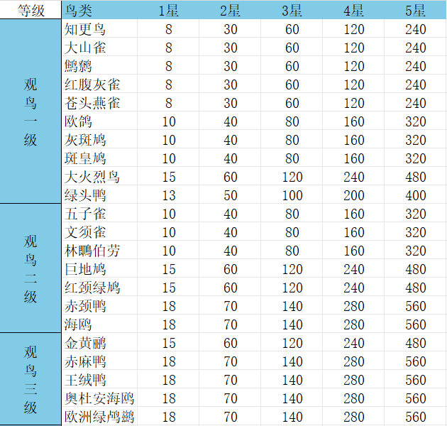 以上就是小编整理带来的《心动小镇手游》观鸟1-8级价格表,更多精彩内容,请点击关注手游网,小编将持续为您更新!