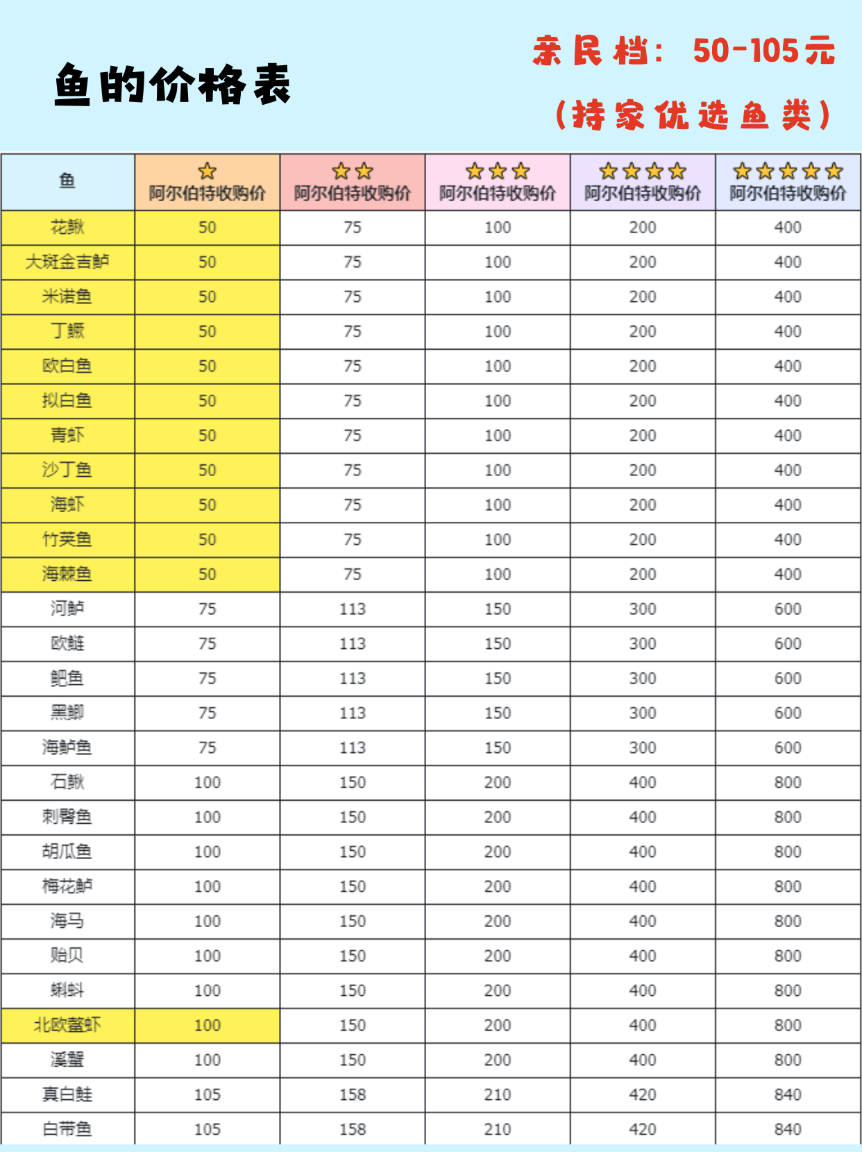 重要tips:1.花鳅 、大斑金吉鲈 、米诺鱼 、丁鳜 、欧白鱼 、拟白鱼 、青虾 、沙丁鱼 、海虾 、竹荚鱼 、海棘鱼 、北欧鳌虾 一⭐是50块的留着做菜