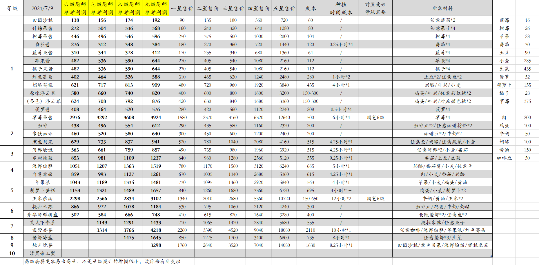七级后等级带来的“高星提升”并不高,所以和之前发的表图的价格有些出入。目前这个趋近于平均利润价格,更为准确