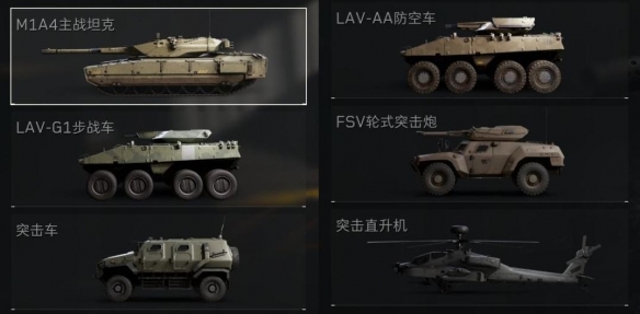 目前可改装的战斗载具共有6种类型,分别是M1A4主战坦克、LAV-G1步战车、突击车、LAV-AA防空车、FSV轮式突击炮、突击直升机。