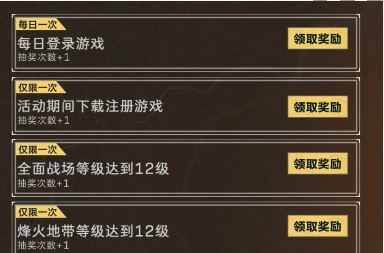 3、全面战场等级达到12级:抽奖次数+1(仅限一次)。