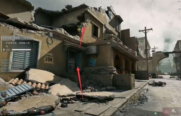 1、在第三关跟着装甲车右转之后能够在丁字路口看到一个炸毁的楼上去。