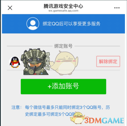 2、点击【添加账号】按钮添加您的游戏账号,根据提示完成绑定操作。