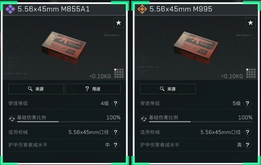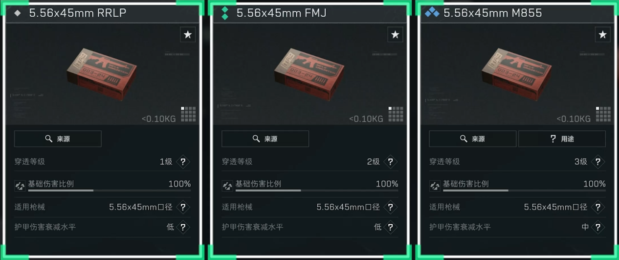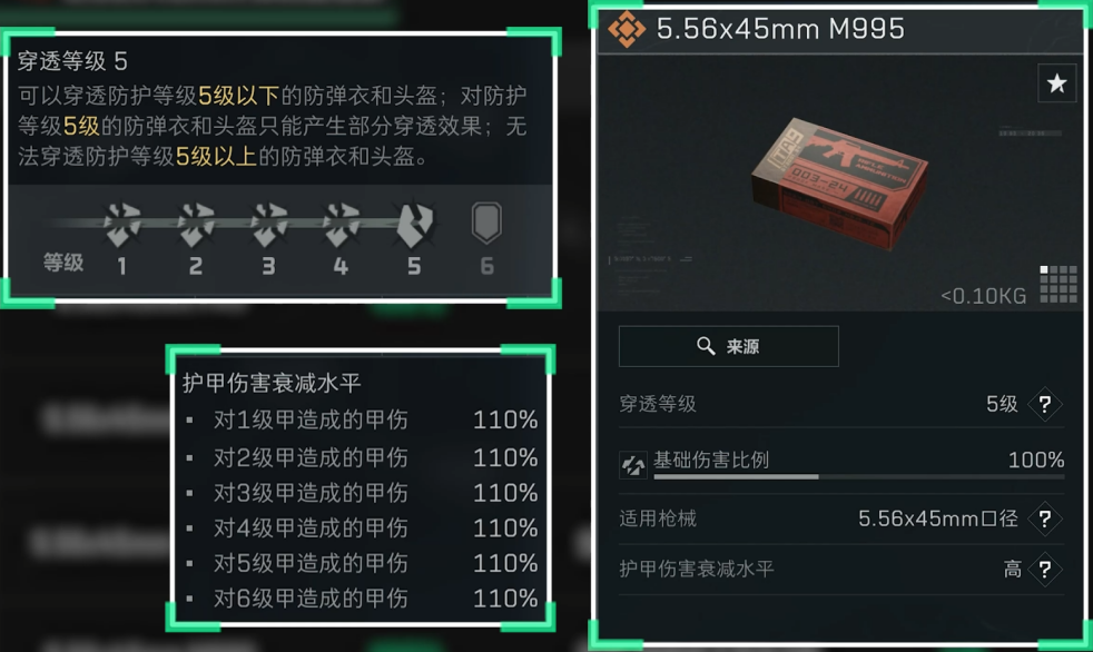 5.56x45mm口径各个型号弹药目前基础伤害比例均为100%,共有从1级到5级,合计5个穿透等级。