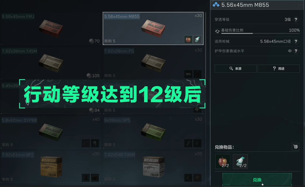 其中前2种型号弹药可在战术部门或交易行中购买,后3种型号弹药主要在交易行中购买、特勤处制造或者对局内搜索直接获得,其中M855型号的弹药在行动等级达到12级后,可以在战术部门兑换获取。