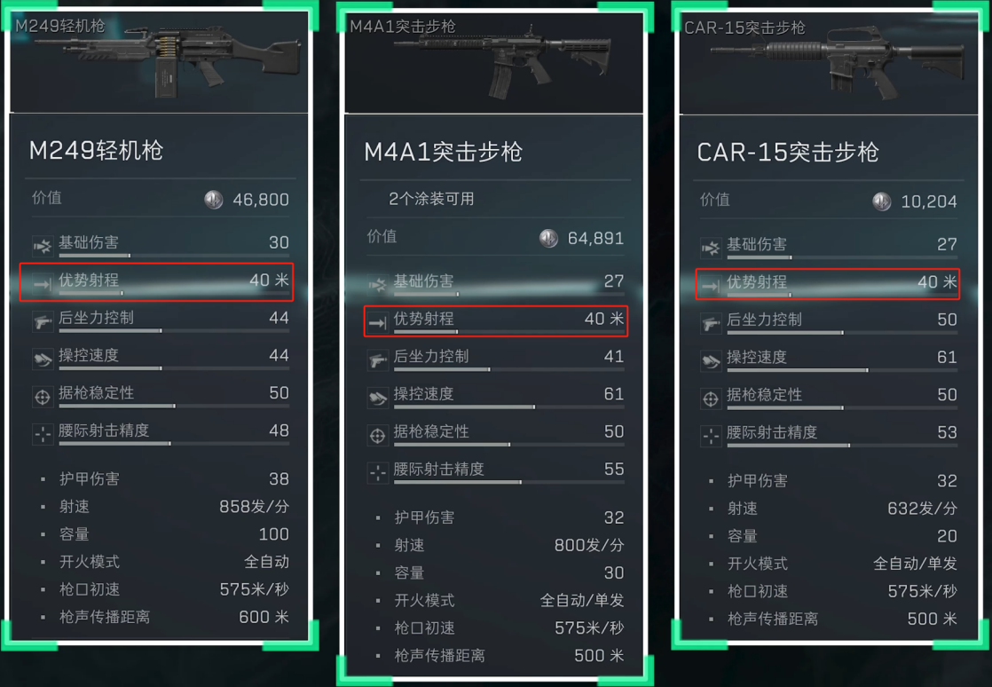 M249轻机枪、M4A1突击步枪和CAR-15突击步枪这3把武器的优势射程都是40米。