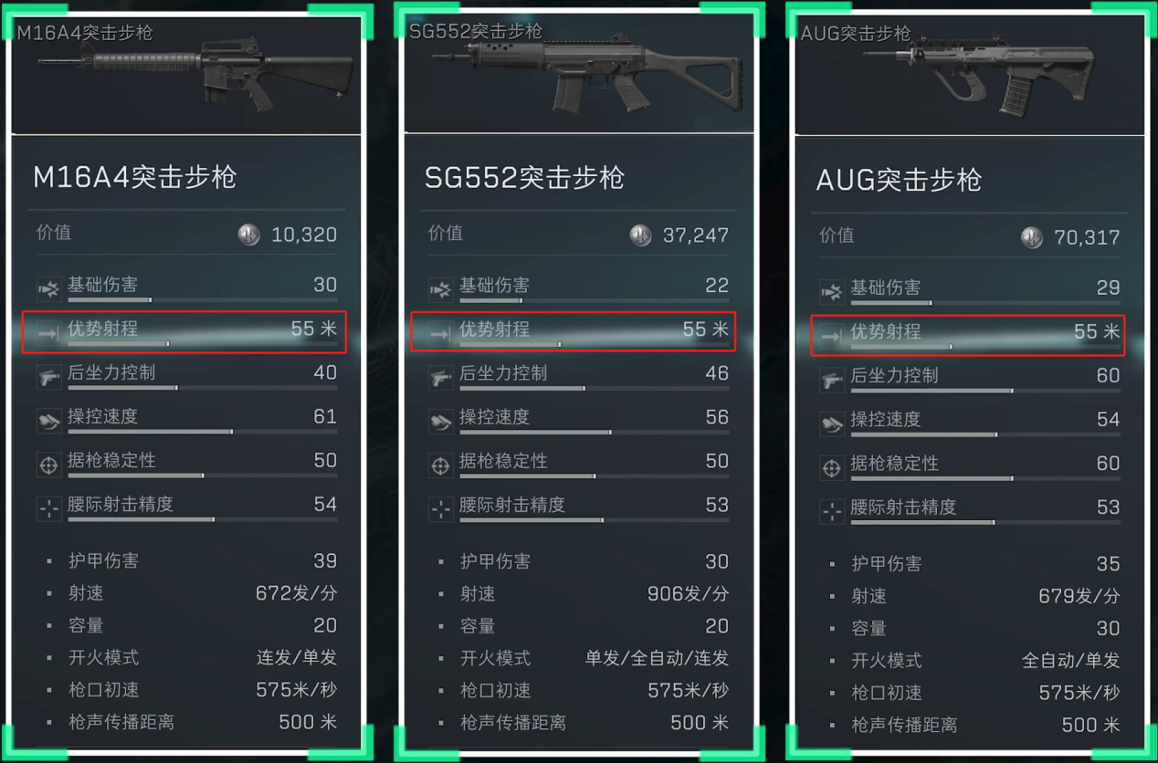 M16A4突击步枪,SG552突击步枪和AUG突击步枪这3把武器的优势射程都是55米。