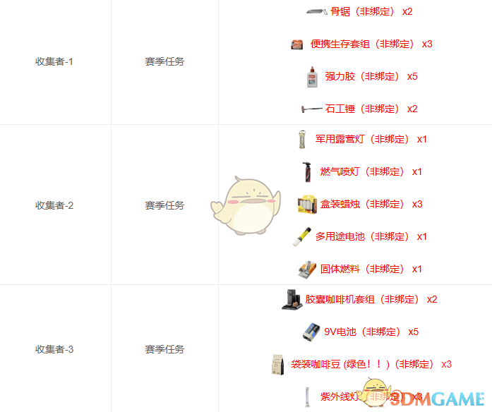 上交物品需求:骨锯(非绑定) x2、便携生存套组(非绑定) x3、强力胶(非绑定) x5、石工锤(非绑定) x2