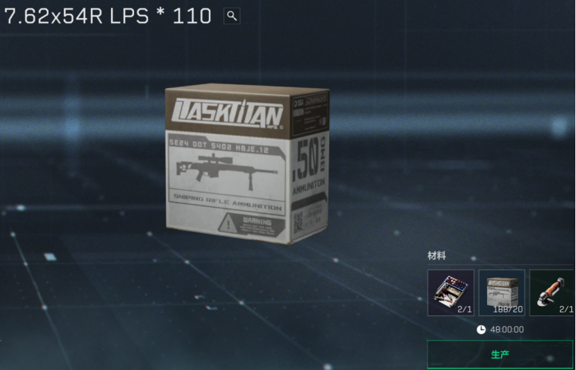 7.62x54R LPS和7.62x54R BT分别是4级弹药和5级弹药,同样可以在交易行中购买,或将工作台升级到3级之后进行生产。