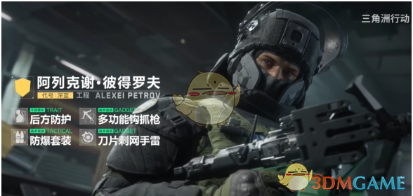 3、深蓝的技能为后方防护、多功能钩抓枪、防爆套装、刀片刺网手雷。