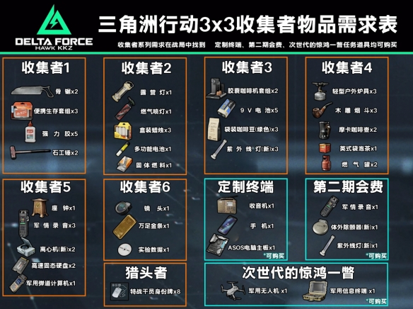 s3赛季已经正式上线了,我们想要完成3x3保险箱需要完成所有的收集者的任务,那么这些任务需要什么道具呢?接下来就由小编给大家带来了详细的《三角洲行动》s3收集者任务全所需道具一览,希望这篇文章可以帮到大家,大家一起来看看吧!