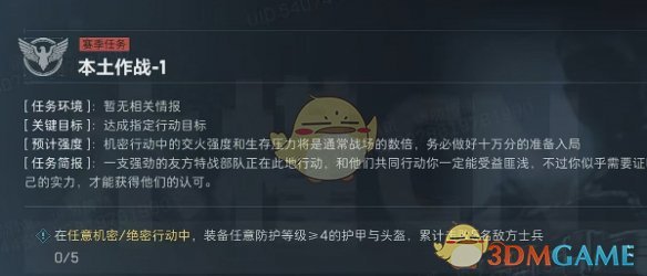 4、任务目标:在任意机密/绝密行动中,装备任意防护等级≥4的护甲与头盔,累计击败5名故方士兵