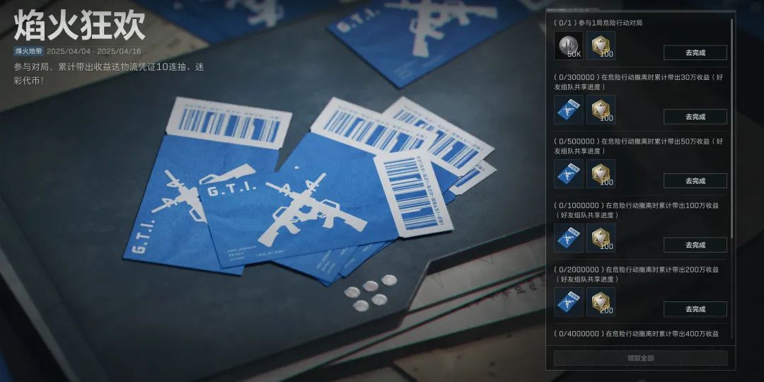 3、烽火地带模式要求干员参与对局,以撤离时带出的收益为指标。完成所有指标可得50K哈夫币、1800迷彩币、10战备物流凭证。