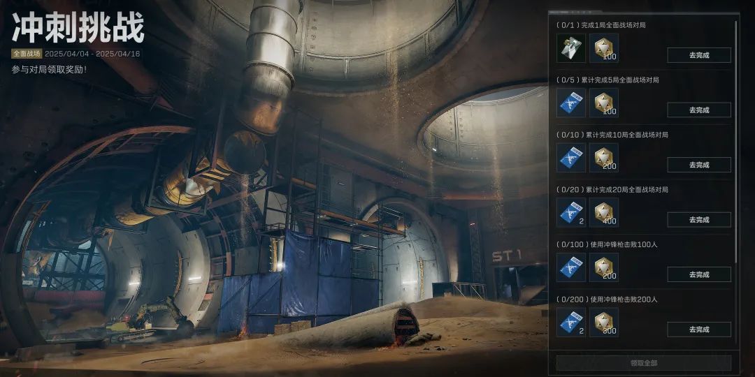 4、全面战场模式同样要求干员参与对局,使用冲锋枪/突击步枪击败指定数量敌人。完成所有指标可得军功倍增卡、1800迷彩币、10战备物流凭证。