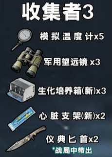 收集者3:5个模拟温度计,3个军用望远镜,3个生化培养箱,2个心脏支架,在机密绝密中带出2个仪典匕首。