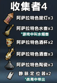收集者4:3个阿萨拉特色提灯,3个阿萨拉风情水壶(水烟壶),2个阿萨拉特色酒杯,3个阿萨拉特色酒壶,3个阿萨拉特色陶瓷,带出2件静脉定位器。