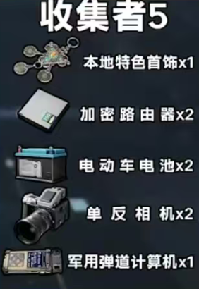 收集者5:1个本地特色首饰,2个加密路由器,2个电动车电池,2个单反相机,1个军用弹道计算机。