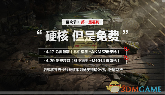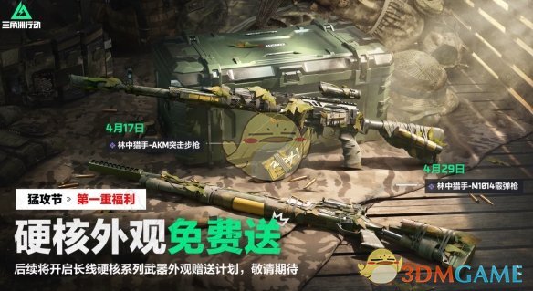 林中猎手系列:登录并完成简单任务,可免费领取【AKM突击步枪-林中猎手】(4月17日)和【M1014霰弹枪-林中猎手】(4月29日),外观以迷彩风格为主,兼具隐蔽性与战术美学。