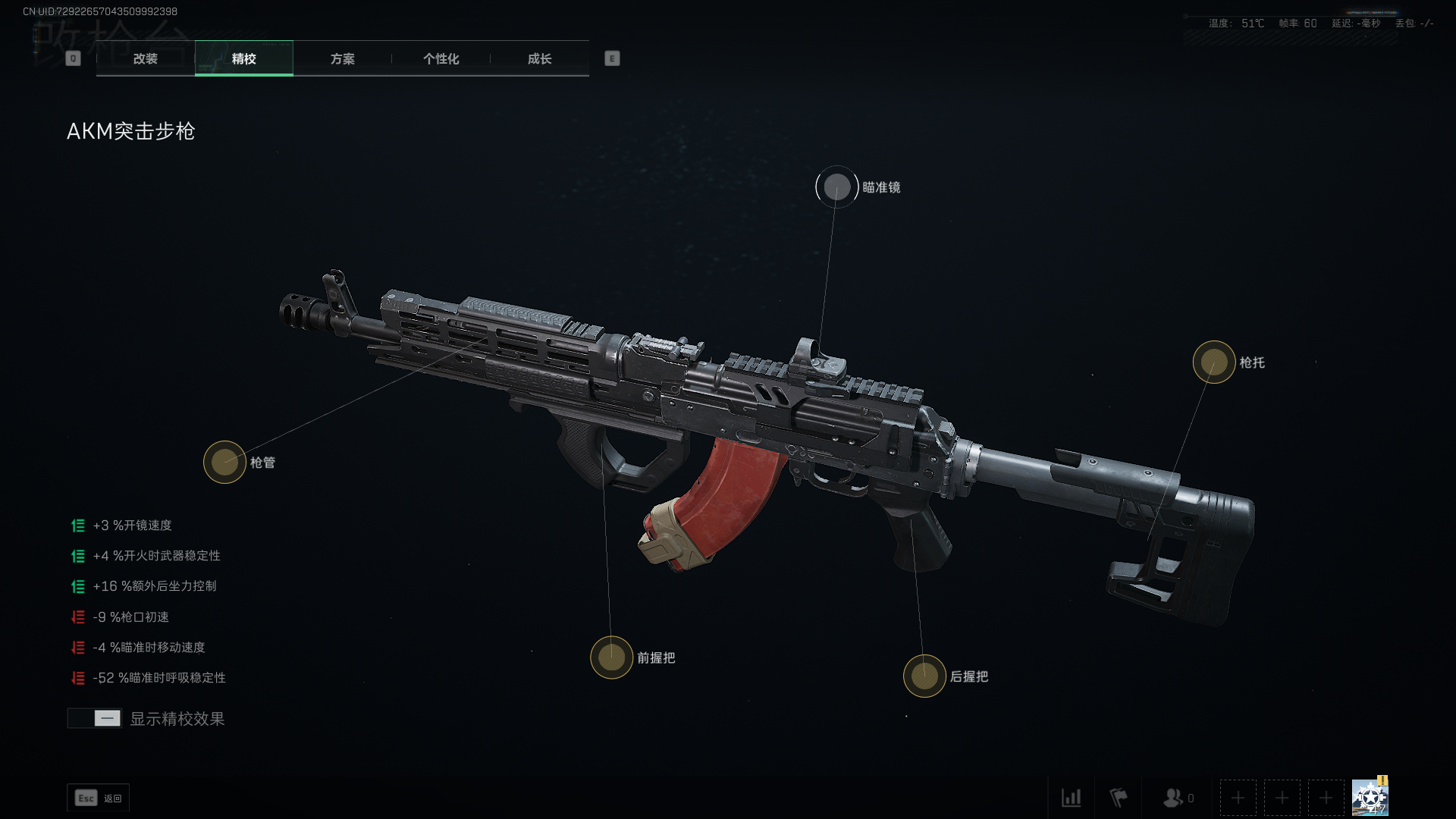 这样一番操作下来AKM相对于默认来说,在后坐力、据枪稳定性和操控速度这三个方面都有一定程度的提升。并且开镜速度能保持在216ms,跑射延迟也能维持在82ms。这两个数据足够AKM在近距离绞肉了,同时也给换装大弹夹、弹鼓留下了空间。