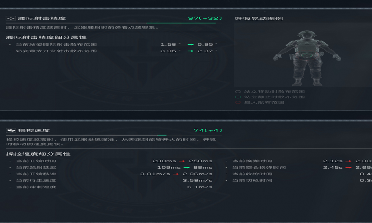 与初始预设相比,腰际射击精度综合评分从原数值提升32点至97,意味着近距离作战时无需开镜即可实现高效命中,尤其适合快速反应和突发遭遇战。