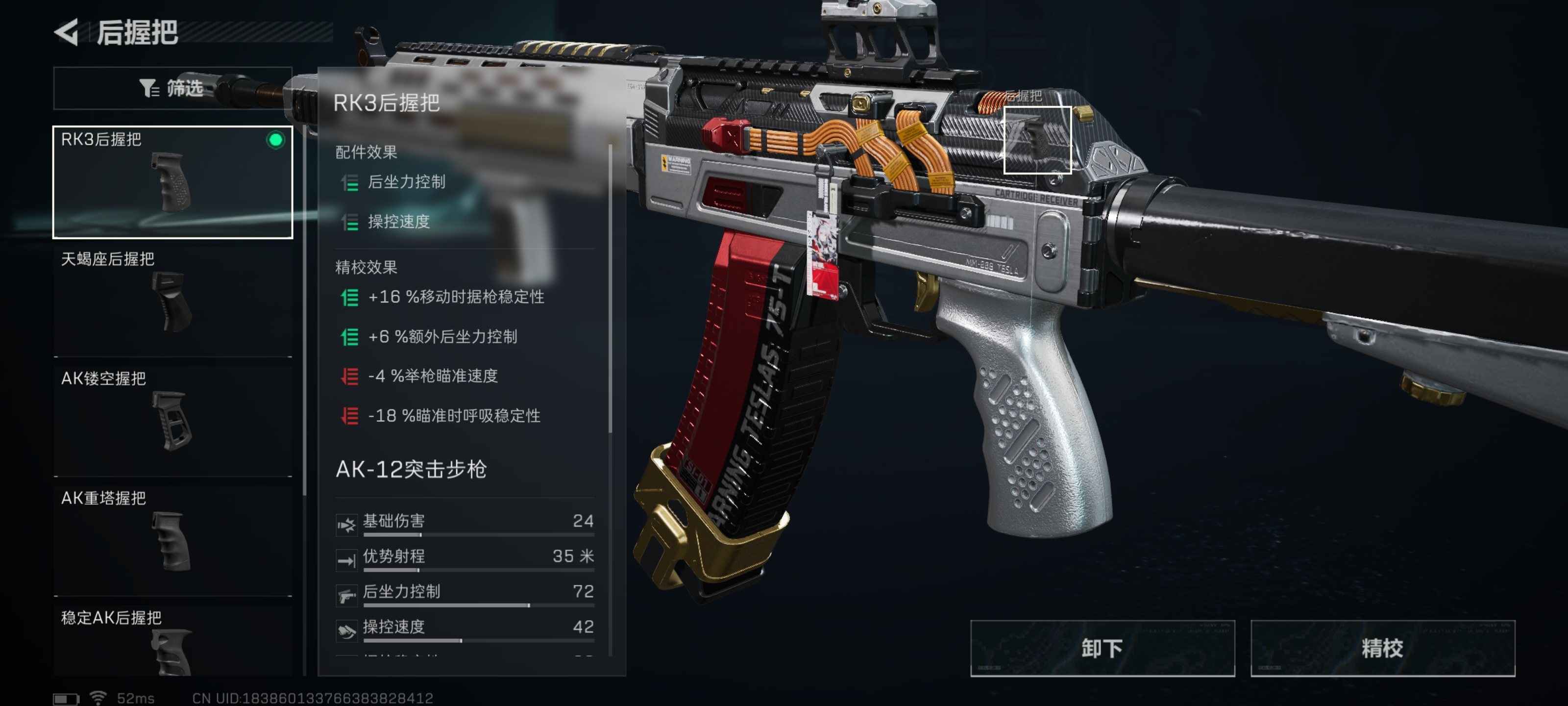 枪管、前握把、枪托、后握把的精校全部向右拉满。在最小程度减少枪械操控速度的情况下,提升枪械的稳定性在实战以及靶场能够拥有更好的压枪表现。