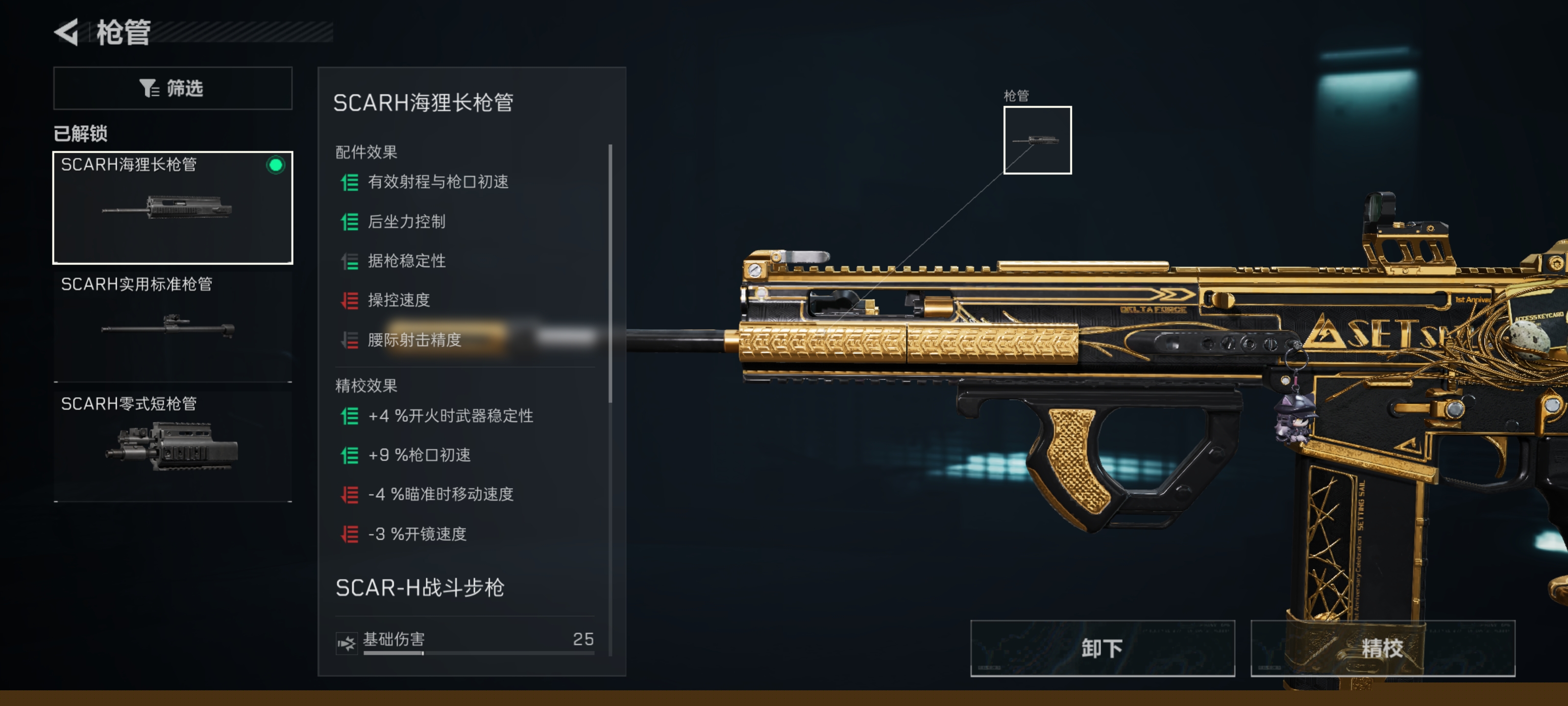 枪管选择SCARH海狸长枪管。虽然大幅度减少操控速度,但是增加了6米的射程以及后坐力控制。