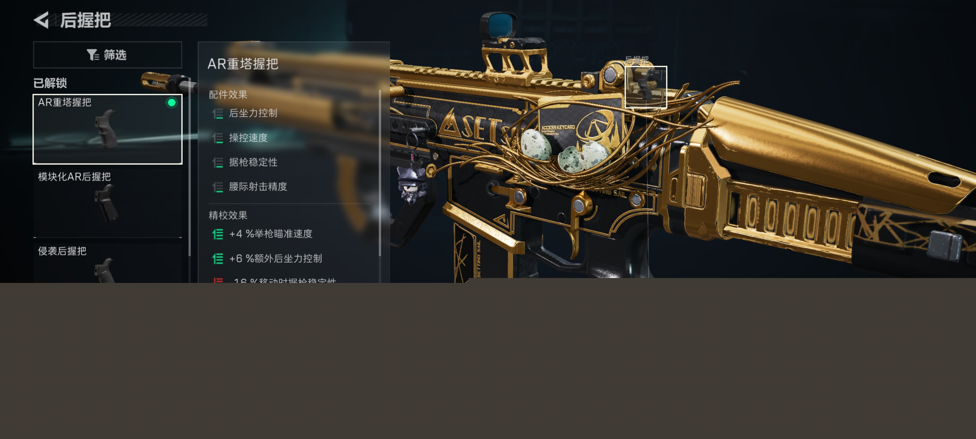 后握把选择AR重塔握把以及平衡握把座。在没有任何负面属性的情况下,小幅度增加后坐力控制、操控速度等属性。