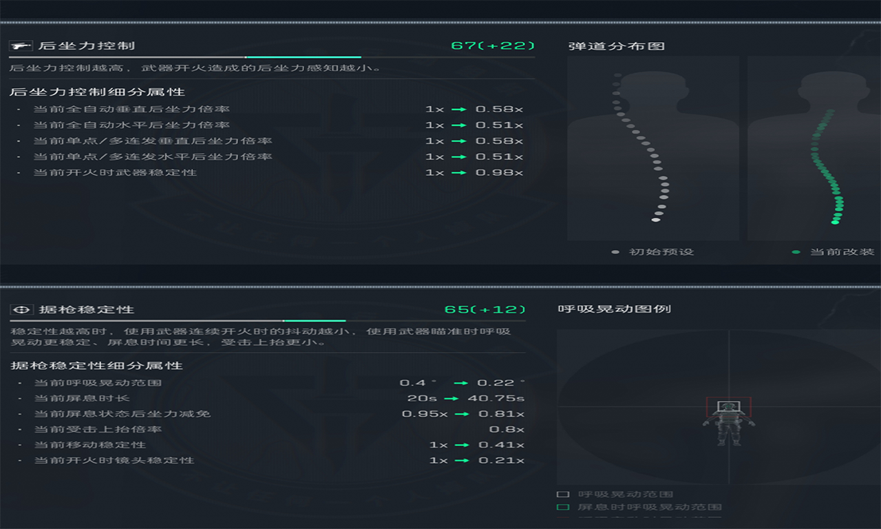 从图中可以看出,改装后后坐力有所降低且视野良好,弹夹也增加到45发,该枪械的射速也快,形成一定程度的火力压制!