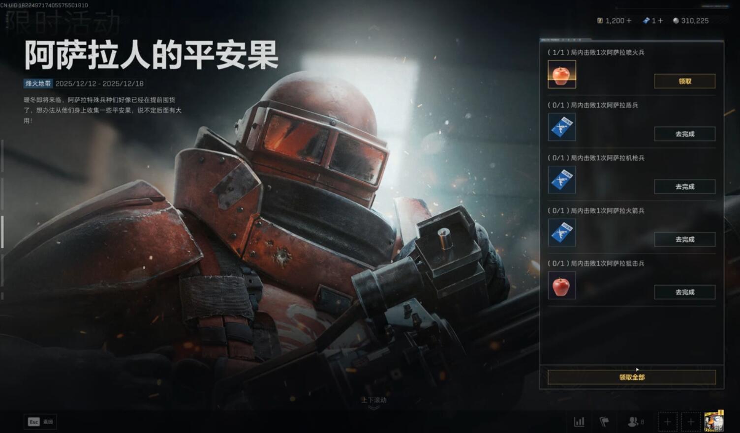 击败敌人:击杀阿萨拉特殊兵种(盾兵、机枪兵等),其盒子随机掉落良品、优品或极品平安果,红色极品价值最大。
