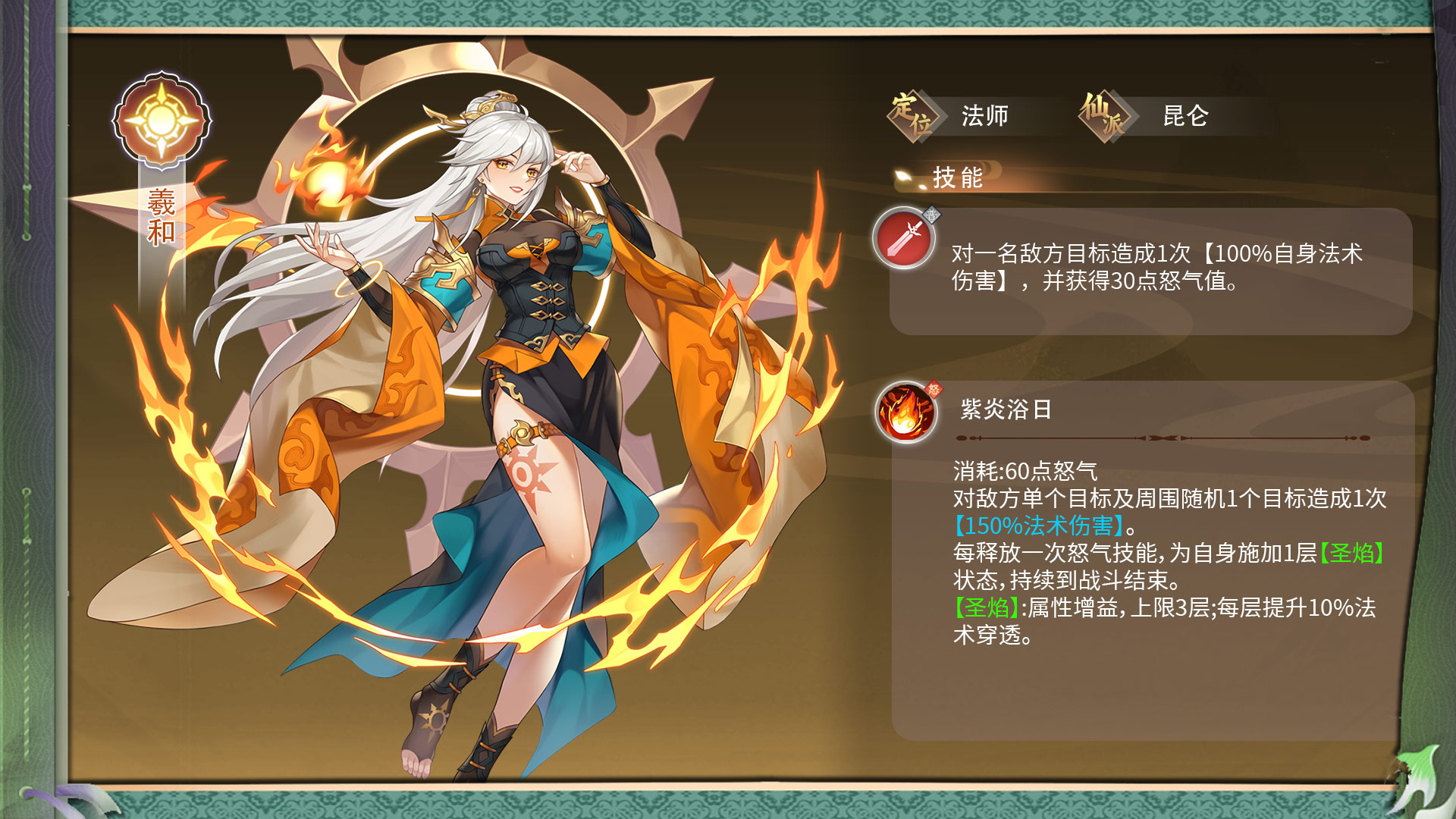 羲和的定位是阳属性的法师,来自于仙派昆仑。