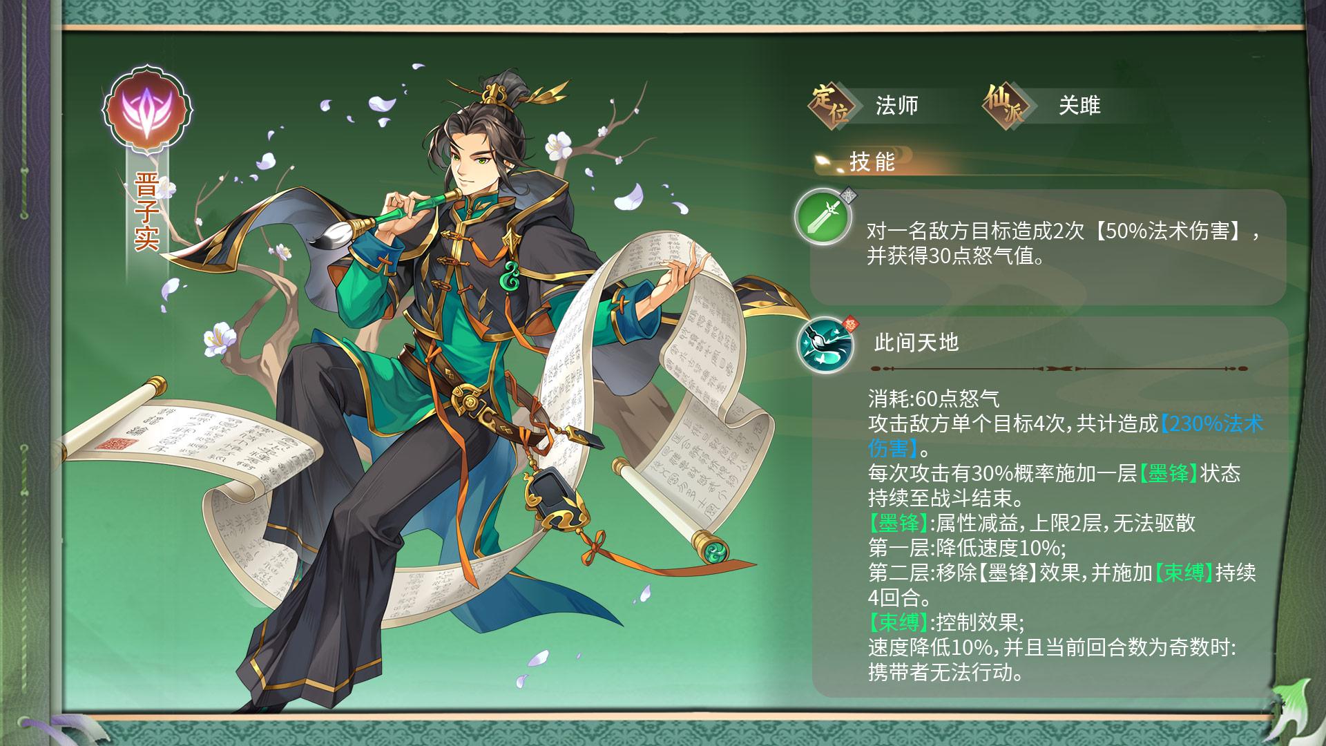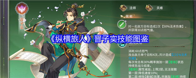 纵横旅人游戏中晋子实的定位是阴属性的法师,来自于仙派关雎。关雎少掌门,醉心书法与山水丹青。于书画中领悟出了独门武学,世人称之为书痴。为人不善交际,寄情山水。但不知为何,在外游历时总会因各种意外而被卷入纠纷中。接下来给大家带来了《纵横旅人》晋子实技能图鉴,包含该伙伴角色的立绘背景技能以及秘法推荐介绍,一起来看看吧!