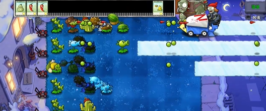 投冰车僵尸的存弹量为 3 发,在将所有冰炸弹投掷完毕后,便会开启向前行驶模式,并且在移动过程中会持续留下冰道,给植物布局带来极大限制。