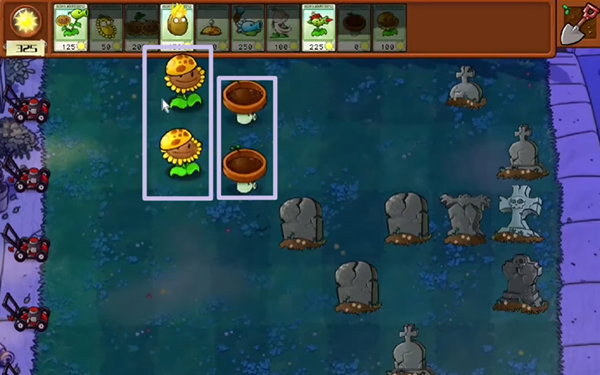 4、阳光向日葵造了一列之后,我们就可以开始建造输出植物了,推荐建造冰香蒲,期间花盆菇和土豆雷,一有就去放。