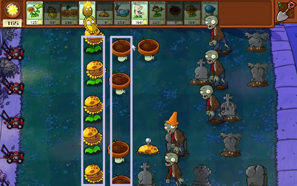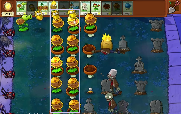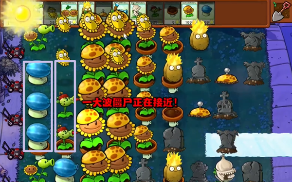 4、中期我们有两列的阳光向日葵之后就去建造冰瓜大喷菇,优先建在中间,可以打三条路的敌人。