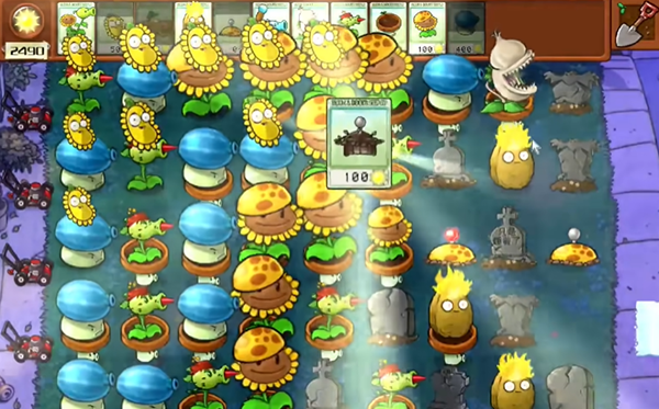2、开局优先建造阳光向日葵,输出炮塔使用小盆菇和土豆雷,小盆菇越多越好。