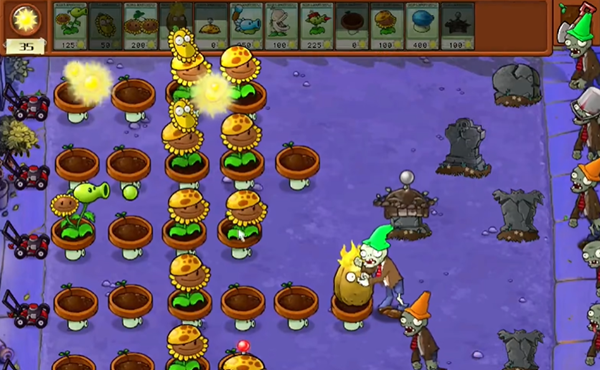 2、开局我们先产阳光,然后把距离我们最近的墓碑清理掉,清掉之后会生成一个土豆雷,这时候这条路就不需要放置输出炮塔了。