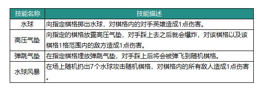 水球:向指定棋格掷出水球,对棋格内的对手英雄造成1点伤害。