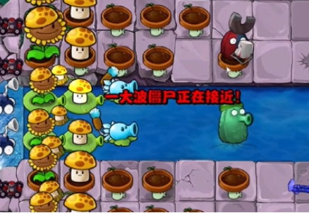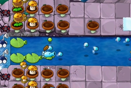 3、在左侧补齐一列阳光菇投手,在泳池中分别种植一个寒冰香蒲和一个高兵菇。