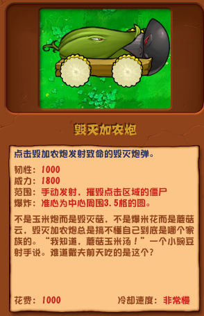 不是玉米炮而是毁灭菇,不是爆米花而是蘑菇云,毁灭加农炮总是搞不懂自己到底是哪个家族的。“我知道,蘑菇玉米汤!”一个小豌豆射手说。难道戴夫前天吃的是这个?