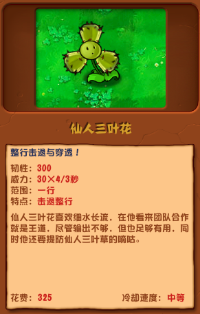 以上就是小编整理带来的植物大战僵尸杂交版仙人三叶花介绍,更多相关游戏攻略,请关注这里下载站!