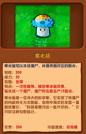 特点:一次性植物,释放寒冰萜效果,每冻结一个僵尸,僵尸所在格生产15阳光