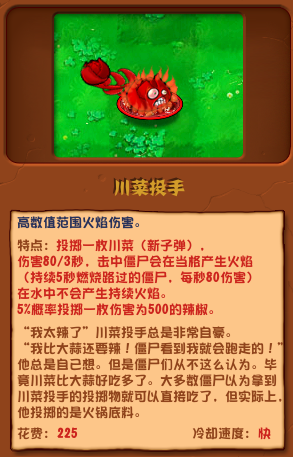 “我太辣了”川菜投手总是非常自豪。我比大蒜还要辣!僵尸看到我就会跑走的!他总是自己想。但是僵尸们从不这么认为。毕竟川菜比大蒜好吃多了。大多数僵尸以为拿到川菜投手的投掷物就可以直接吃了,但实际上他投掷的是火锅底料。
