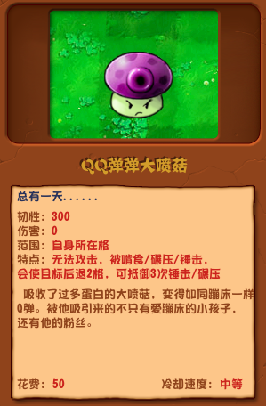 植物大战僵尸杂交版QQ弹弹大喷菇怎么样?植物大战僵尸杂交版QQ弹弹大喷菇将传统的大喷菇进行了改良,没有了伤害能力但是变得更加可爱,可以击退三次见识,就像弹簧一样,很多玩家不知道QQ弹弹大喷菇有什么用,下面为大家带来QQ弹弹大喷菇介绍。
