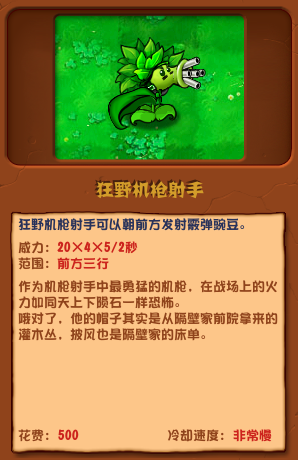 狂野机枪射手可以朝前方发射霰弹豌豆。