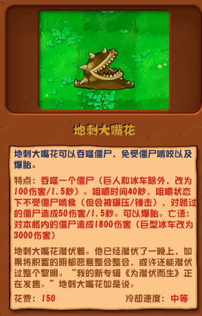 以上就是小编整理带来的植物大战僵尸杂交版地刺大嘴花介绍,更多相关游戏攻略,请关注这里下载站!