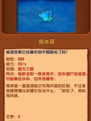 注:海冰菇可以对僵尸发射冰孢子,在夜晚时的水中海冰菇还可以对僵尸造成减速效果。