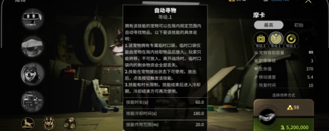 拥有该技能的宠物可以在局内规定范围内自动寻找物品,该宠物拥有专属临时口袋,临时口袋仅能由宠物在局内拾取物品后放入,玩家只能转移,不可放入,离开战场时,临时口袋内的剩余物资会全部丢失。
