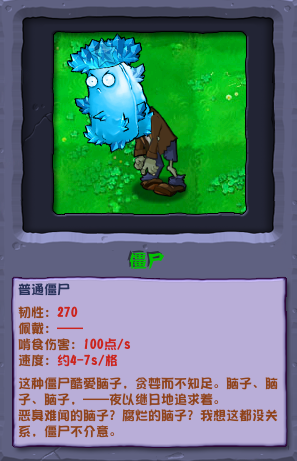 对战思路:很普通的一种僵尸,特点就是可以减速冰冻植物,我们可以使用附带火焰的植物进行消融,比如辣椒、火焰豌豆和川菜投手的子弹。