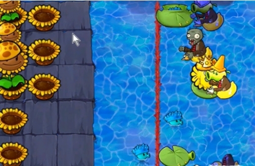 2、先在甲板上种植两列向日葵花盆和多个阳光向日葵,在红线右侧种植多个豌豆睡莲。